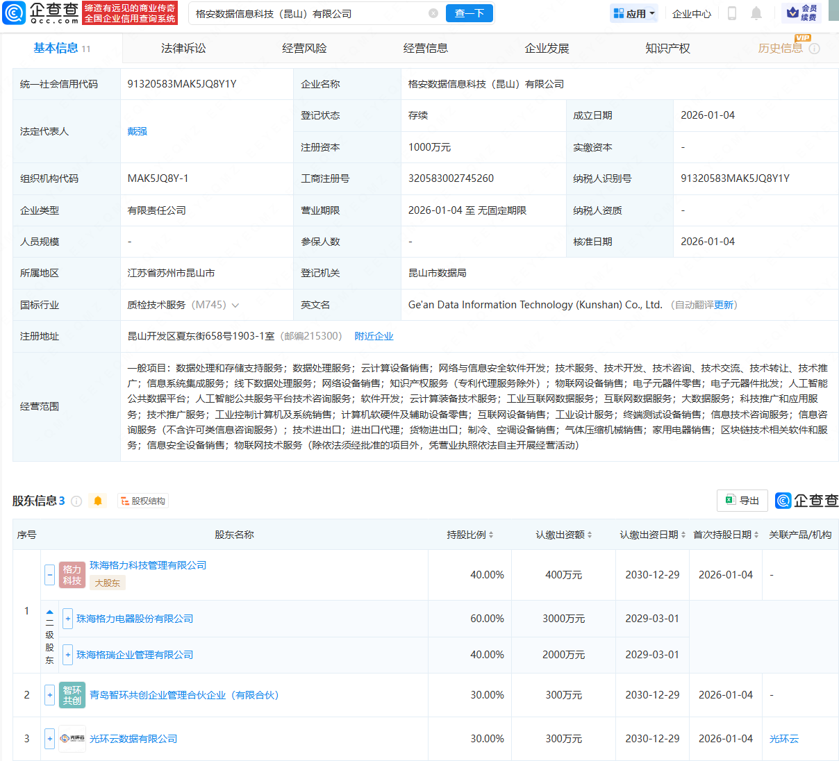 近日,格安数据信息科技(昆山)有限公司成立,法定代表人为戴强专业的股票配资,注册资本为1000万元,经营范围包含:数据处理和存储支持服务;数据处理服务;云计算设备销售;物联网设备销售;电子元器件零售等。企查查股权穿透显示,该公司由格力电器(000651)旗下珠海格力科技管理有限公司、光环云数据有限公司等共同持股。